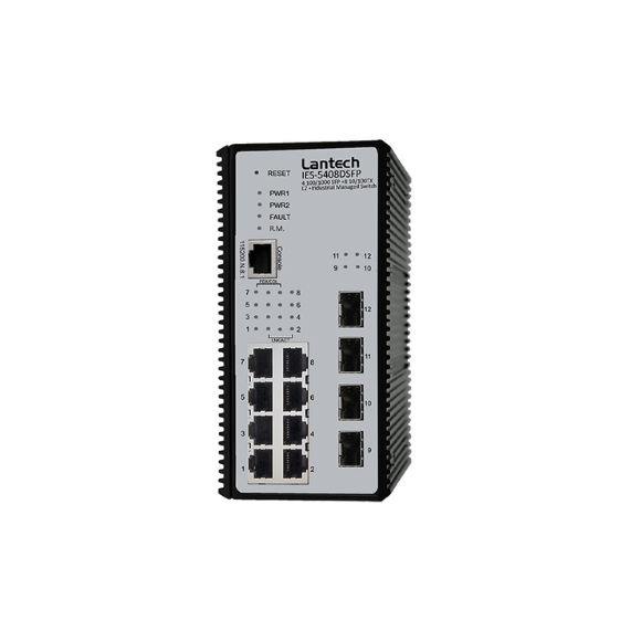 - IES-5408DSFP của Lantech Communications Global là switch công nghiệp hiệu năng cao chuẩn L2+ (uplink Gigabit), được trang bị 8 cổng 10/100TX và 4 cổng SFP tốc độ kép. Thiết bị cung cấp khả năng chuyển mạch tốc độ dây (wire-speed) cùng các tính năng bảo mật nâng cao, phù hợp cho các hệ thống aggregation trong mạng công nghiệp quy mô lớn.