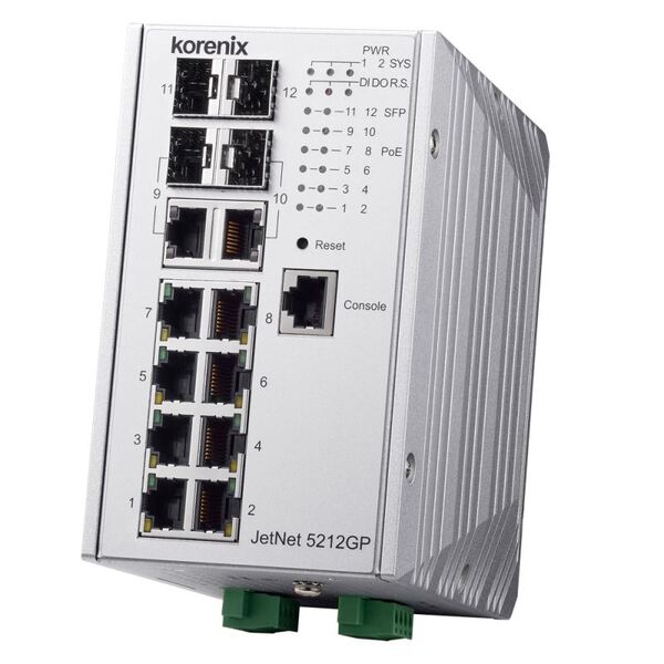 Korenix JetNet 5212GP, the DIN-Rail type industrial Gigabit Managed PoE Switch is designed with eight 10/100/1000 TX ports, two Gigabit RJ-45/ SFP combo ports and two Gigabit SFP port. JetNet 5212GP is the first industrial ethernet switch compliance with IEEE 802.3 af/at/bt, each ethernet port can max supports 90 W for PD, and total budget up to 480 W *Note.