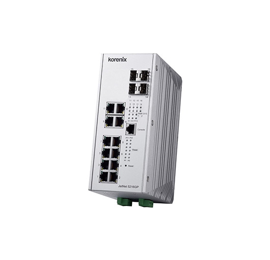 Korenix JetNet 5216GP Series, the DIN-Rail type industrial Gigabit Managed PoE Switch. JetNet 5216GP is the first industrial ethernet switch compliance with IEEE 802.3 af/at/bt, each ethernet port can max supports 90W for PD, and total budget up to 480W *Note.