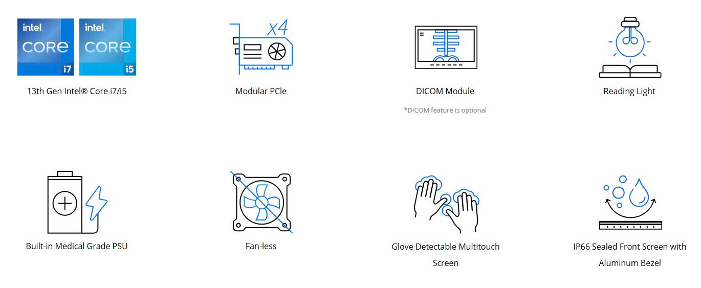 23.8" 350cd/m² FHD medical panel PC with 13th generation 10nm Intel®Raptor Lake-P Core™ i7-1370PE 4.8GHz on-board processor,802.11a/b/g/n/ac/ax Wi-Fi 6E module,PCAP touchscreen w/ AG coating,DICOM,